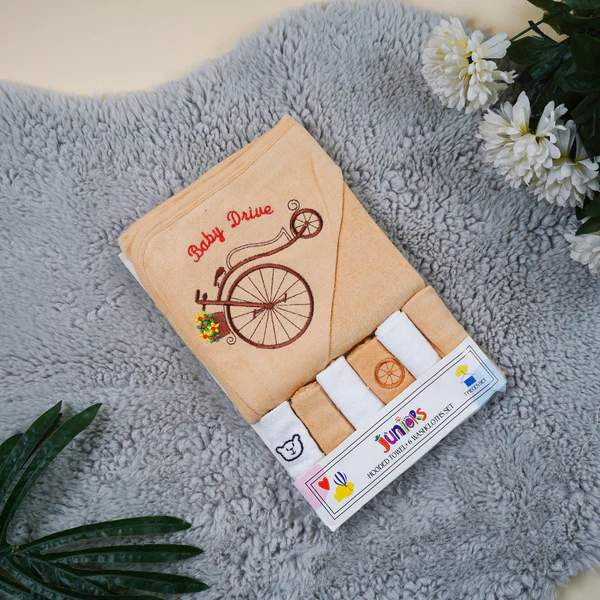 Made from high-quality cotton, the material is ultra-soft, absorbent, and breathable — ideal for drying delicate baby skin quickly without irritation. The hooded towel features a charming “Baby Drive” embroidery with a cute bicycle design that adds a touch of whimsy and warmth to every post-bath snuggle.
