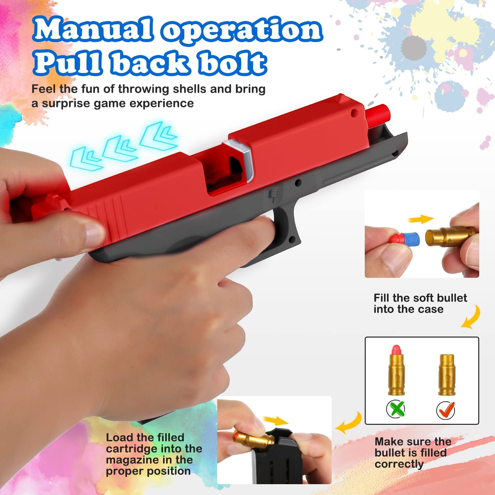 The toy includes a detachable toy silencer, cartridge holder, and realistic-style cartridge cases, giving children a complete imaginative play experience. The pull-back mechanism enables smooth loading and shooting using soft elastic foam bullets that are designed to be impact-safe and gentle.